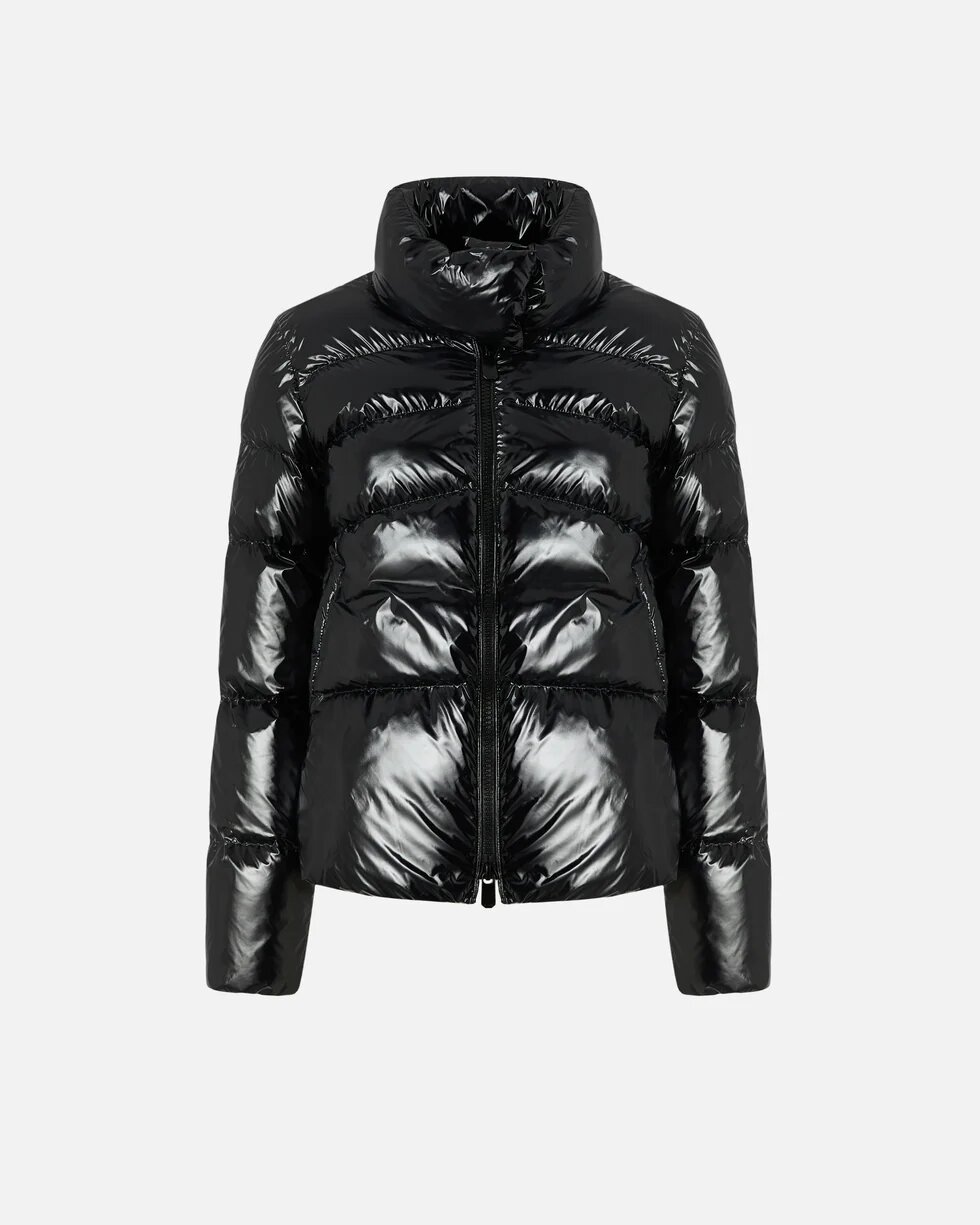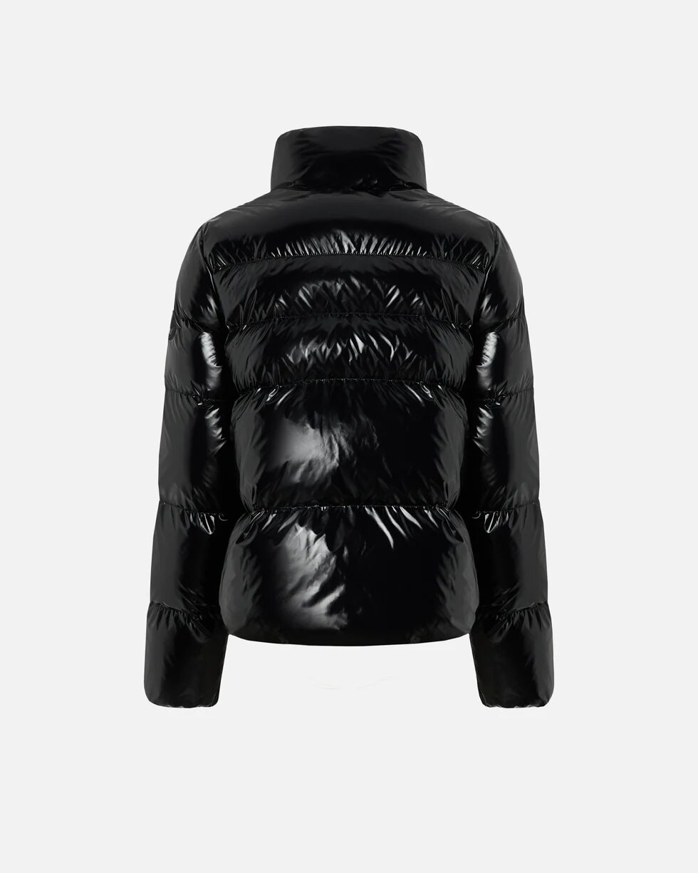 Piumino imbottito dalla silhouette caban in tessuto crystal nylon dal particolare finishing lucido, personalizzato da patch logo Love Birds su una manica. Il modello è caratterizzato da una trapuntatura orizzontale, leggermente obliqua sul davanti, ed è dotato di un avvolgente collo alto con bottoni nascosti per proteggerti dal freddo. Chiusura con zip a doppio cursore in metallo davanti.